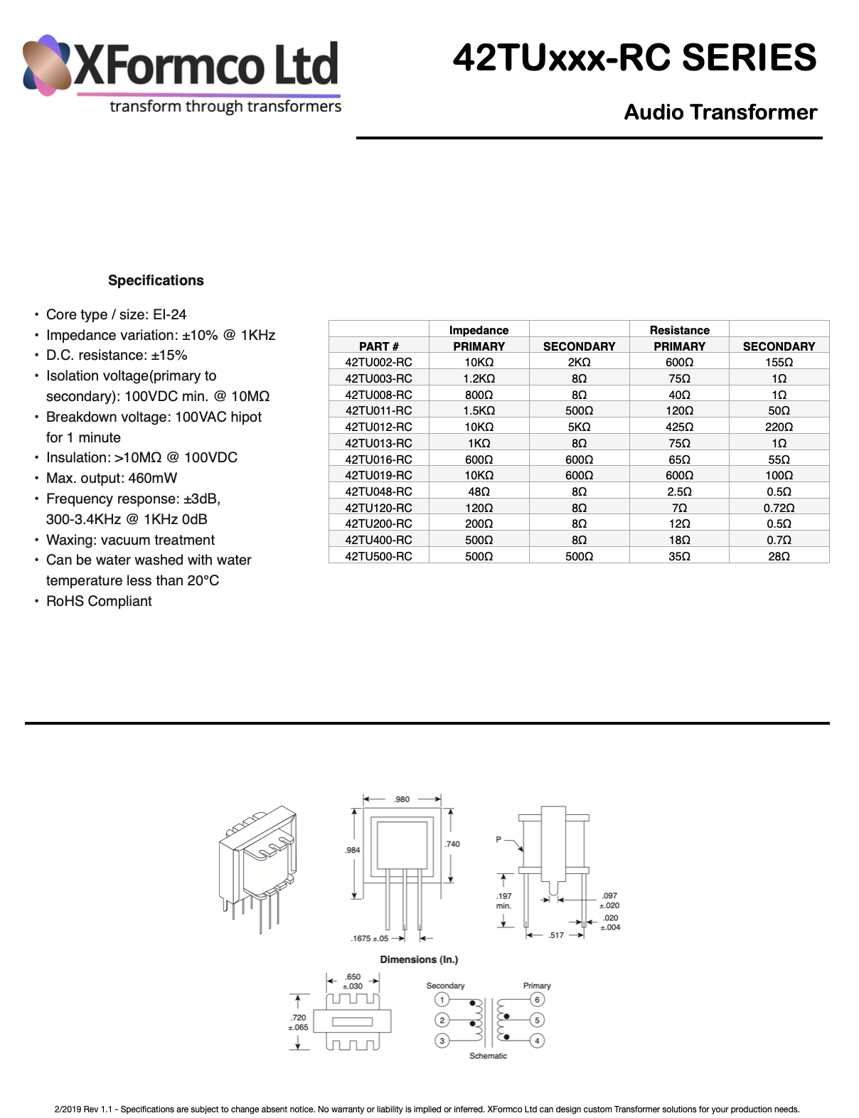 Isolation voltage(primary to secondary): 100VDC min. @ 10MΩ